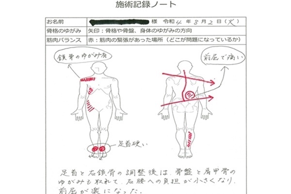 毎回の施術内容や体の反応を記録し、変化を共有しています。「なんとなく良くなった」ではなく、どこがどう変わったのかを一緒に確認しながら進めていきます。